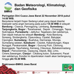 Prakiraan BMG, Kamis 22 November 2018 Pukul 14.30 WIB, Bandung Diguyur Hujan Lebat Disertai Petir dan Angin Kencang INFOGRAFIS 22 Nov 2018 komentar BACA JUGA: Ini Alur Proses Pemungutan Suara Pemilu 2019 di TPS Share