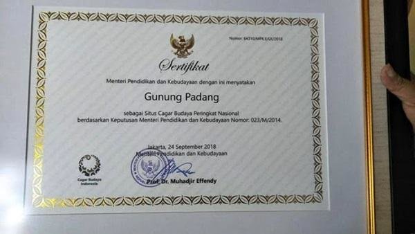Maka selaras dengan program tersebut, pada Desember 2018 lalu, situs megalitikum Gunung Padang ini telah resmi berubah nama menjadi Cagar Budaya Nasional Gunung Padang. Peresmian perubahan nama ini ditandai penyerahan sertifikat dari Kementerian Pendidikan dan Kebudayaan kepada Dinas Pendidikan dan Kebudayaan Kabupaten Cianjur.